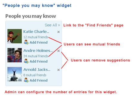 - Friend Recommendations (People you may know) widget, which also enables users to see mutual friends.