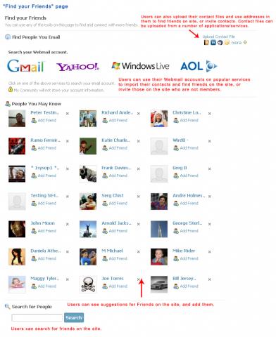 This plugin provides your social network and its users effective tools to expand their social graphs. It enables your site to give sound recommendations to users for adding friends. Users can also suggest friends to their other friends, and these trusted suggestions can lead to a chain of friend additions. Users can also securely import their contact lists / address books from popular email services and applications to invite their contacts to the site, or to see which of their contacts are site members, and add them as friends. These features are very similar to the ones on Facebook and allow for quick growth in your site's user-base, connections and engagements.